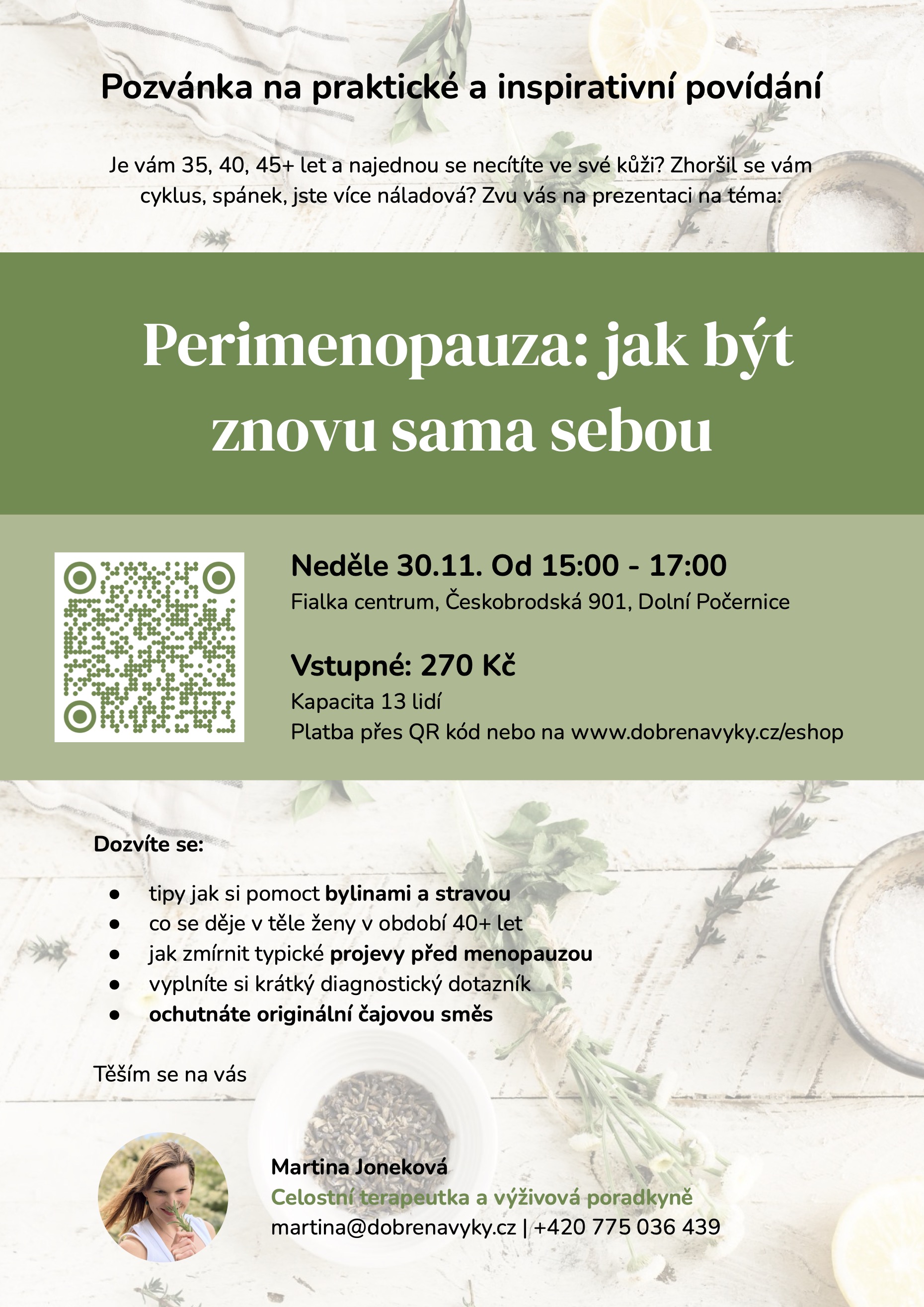 Srdečně vás zveme na workshop s celostní terapeutkou a výživovou poradkyní Martinou Jonekovou na téma PERIMENOPAUZA. Bude se konat 30.11. od 15 do 17hod.